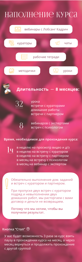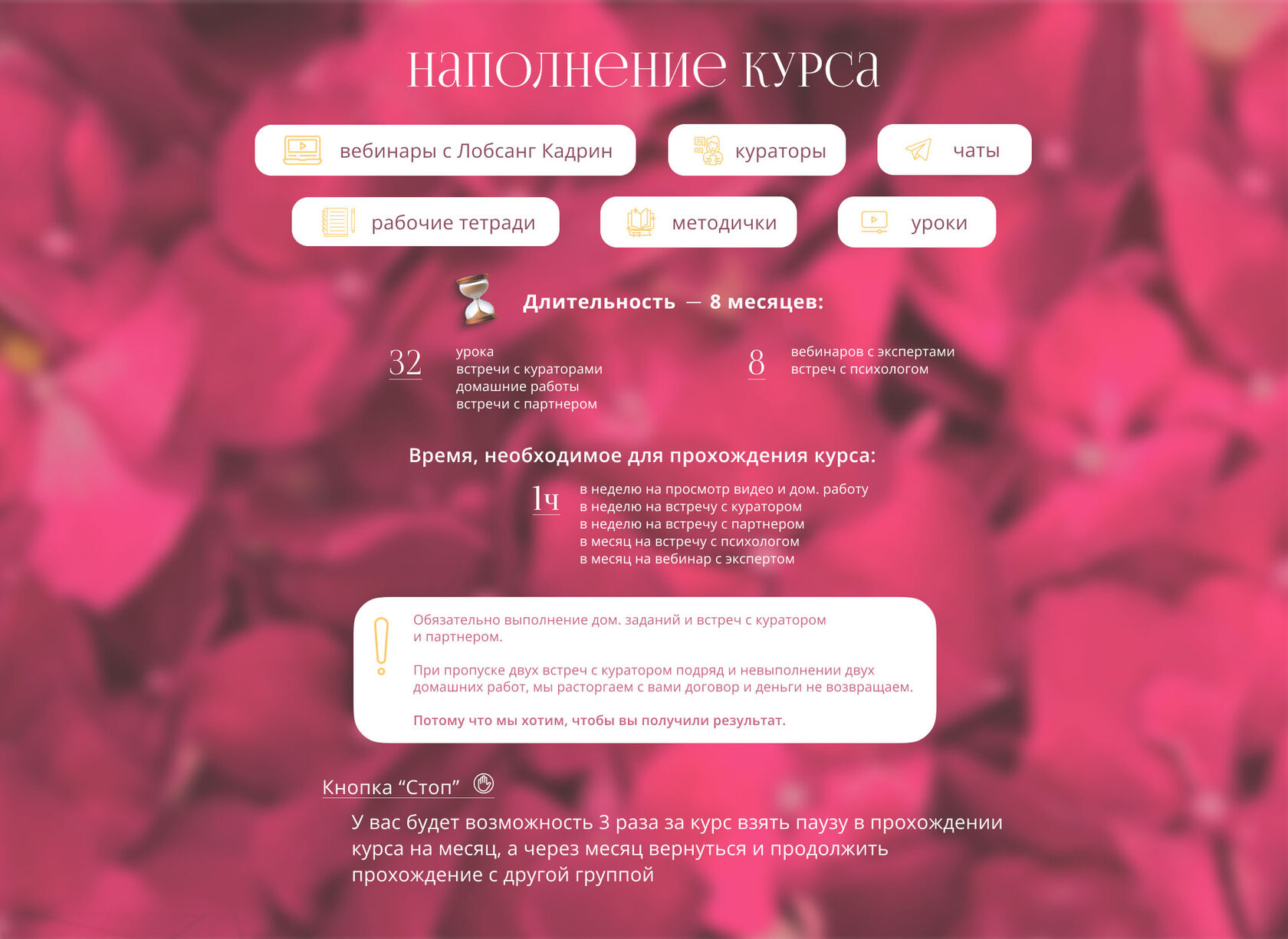 Все занятия записаны Лобсанг Кадрин и загружены на обучающую платформу, после оплаты вы получите доступ к курсу. Вам нужно будет смотреть одно занятие в неделю и делать домашние задания. После этого встреча с куратором, которая будет проходить в программе Zoom. Вам необходимо установить Zoom на свой гаджет.
